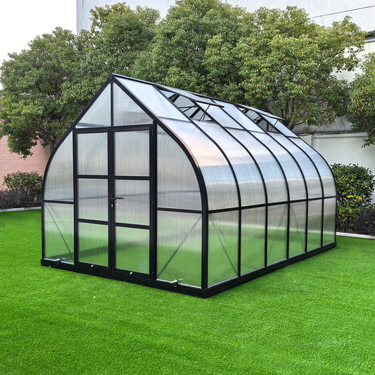 All greenhouses include vents and base. Additional accessories are available in separated kits: Shelving, Solar Fans, Louvers, and Automatic Vents Openers.